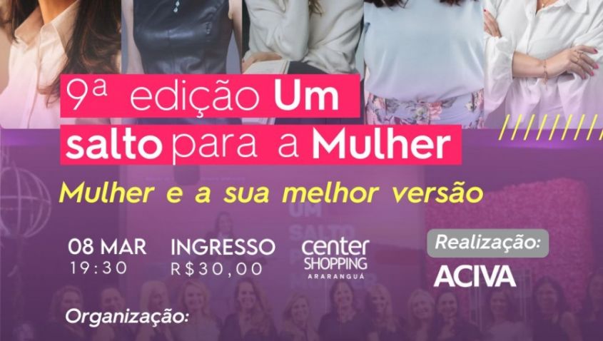 Buscando fomentar e fortalecer as mulheres empreendedoras da região do Extremo Sul de Santa Catarina, o Núcleo da Mulher Empresária da Aciva (Associação Empresarial de Araranguá e do Extremo Sul Catarinense) realizará no próximo dia 08 de março a 9ª edição do ‘Um salto para Mulher’. O evento acontecerá a partir das 19h30, no Center Shopping Araranguá.