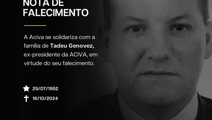A Associação Empresarial de Araranguá e do Extremo Sul Catarinense (Aciva) manifesta seu profundo pesar pelo falecimento do ex-presidente Tadeu Genovez, que esteve à frente da entidade por três gestões, entre os anos de: 1993-1994, 1997-1998 e 1999-2000.