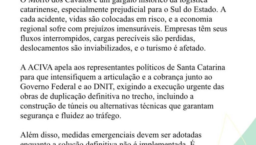 A ACIVA apela aos representantes políticos de Santa Catarina para que intensifiquem a articulação e a cobrança junto ao Governo Federal e ao DNIT, exigindo a execução urgente das obras de duplicação definitiva no trecho, incluindo a construção de túneis ou alternativas técnicas que garantam segurança e fluidez ao tráfego.