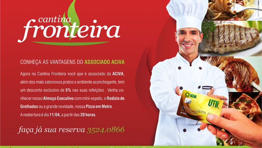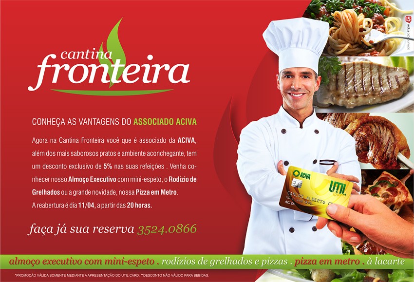 Os usuários do Cartão Útil Card podem comemorar o credenciamento da Cantina Fronteira, que iniciou 2012 repleta de novidades como a saborosa pizza em metro. Associada da ACIVA há dois meses, solicitou o credenciamento a fim de oferecer aos seus clientes maior praticidade na hora do pagamento.
