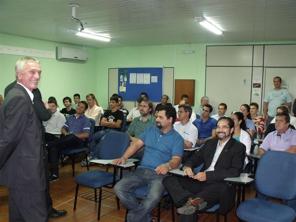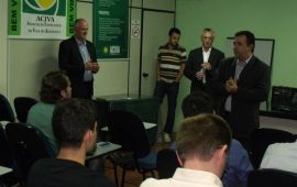 Na terça, 05, aconteceu no auditório da ACIVA uma palestra promovida pela entidade com o Núcleo de Jovens Empreendedores – AJE , com engenheiro alemão Reinhard Foertsch, que contou com a participação do consultor Andreas Dohle – também da Alemanha, para tratar do uso de energias renováveis. Os convidados representam uma empresa alemã, que desenvolveu um sistema de produção de energia solar, que podem ser usadas em residências e em grandes escalas. O objetivo dos palestrantes foi mostrar para os participantes do encontro, a capacidade de produzir energia solar no Brasil e a economia conquistada com isso. De acordo com Foertsch, o uso da tecnologia usada em seu país, poderá trazer muitos benefícios aos brasileiros. “O investimento depende da demanda de cada um, mas se considerar a economia que se terá em algum tempo, a energia sairá para cada consumidor praticamente de graça”, disse. A proposta do palestrante é captar a energia através de painéis e com um método tecnológico desenvolvido em seu país, essa energia ser transformada e consumida. A ideia de Reinhard Foertsch consiste no uso da energia suficiente para abastecer o ambiente e o que sobrar devolvida para a rede pública, e que possa ser utilizada em alguns anos pelo mesmo consumidor ou até abatida de sua conta. “O benefício é que não se gasta com manutenção e ainda não prejudica o meio ambiente”, lembrou. O consultor regional da Federação das Associações Empresariais de Santa Catarina, Marcos Fortunato, que acompanha os palestrantes nos encontros com empresários de todo o Extremo Sul, concluiu que a reunião em Araranguá foi positiva. “A receptividade dos empresários foi como esperávamos. O poder público precisa se engajar também para que possamos construir cidades inteligentes e sustentáveis”. Participaram da palestra além de integrantes do AJE, dirigentes da ACIVA, presidente da AMESC, prefeito Ronaldo Carlessi, diretor da Fundação Ambiental do Município de Araranguá, Paulo Simon e profissionais liberais da região. Os organizadores do evento pretendem promover novos encontros com esse perfil e promover conceitos ambientais nos diversos ramos de atividade explorados na região de Araranguá