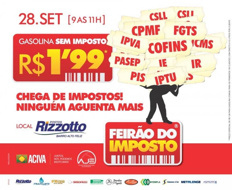 No próximo sábado, 28, das 9h às 11h, o Posto Rizzotto, no bairro Alto Feliz, irá comercializar gasolina sem impostos, ao preço de R$ 1,99 aos 100 primeiros clientes. Entre as regras da ação está a restrição de venda de, no máximo, 10 litros por cliente. “Acompanhamos as ações do CEJESC e, em conjunto, analisamos o modelo de ação que poderia ser aplicado em nossa cidade. Nossa expectativa é positiva, contamos com a participação da população”, destaca o coordenador do Núcleo do Jovem Empreendedor, Alberto Sasso.