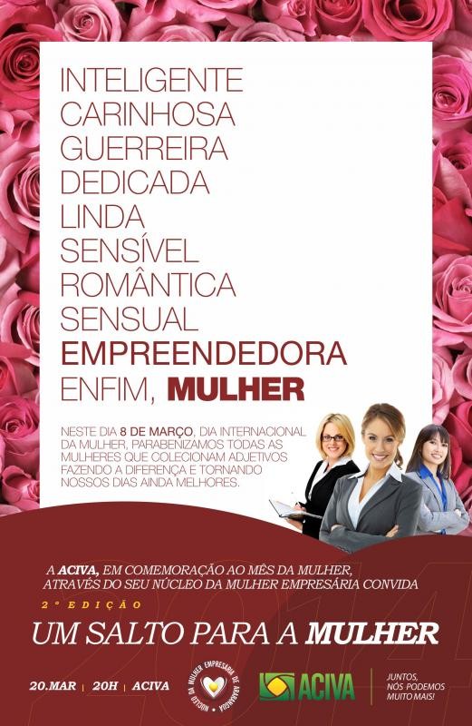 Em alusão ao Dia Internacional da Mulher, comemorado neste sábado, 8 de março, a Associação Empresarial de Araranguá e do Extremo Sul Catarinense, por meio do Núcleo da Mulher Empresária, promove a segunda edição do Salto para a Mulher.