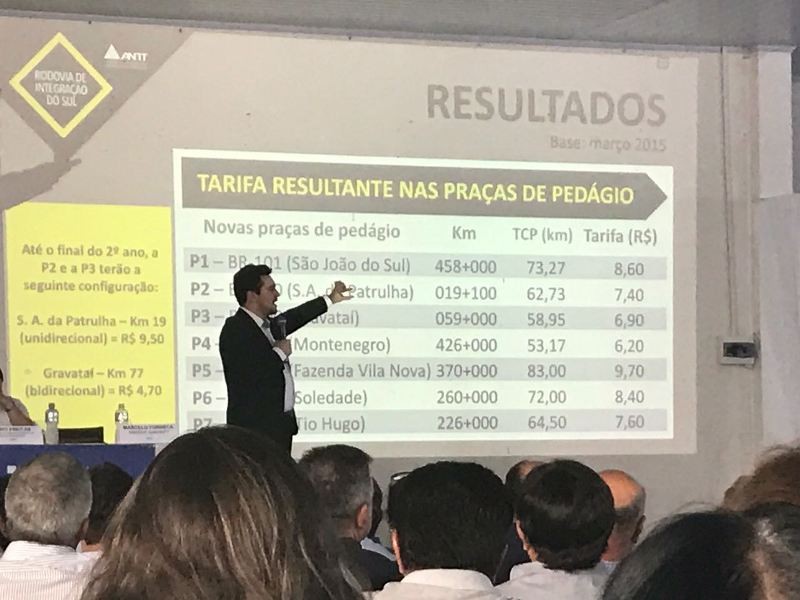 No encontro foi apresentado o valor de R$ 8,60, para carros pequenos. O leilão está previsto para novembro e a implantação para o primeiro trimestre de 2018, no quilometro 458 da BR-101.