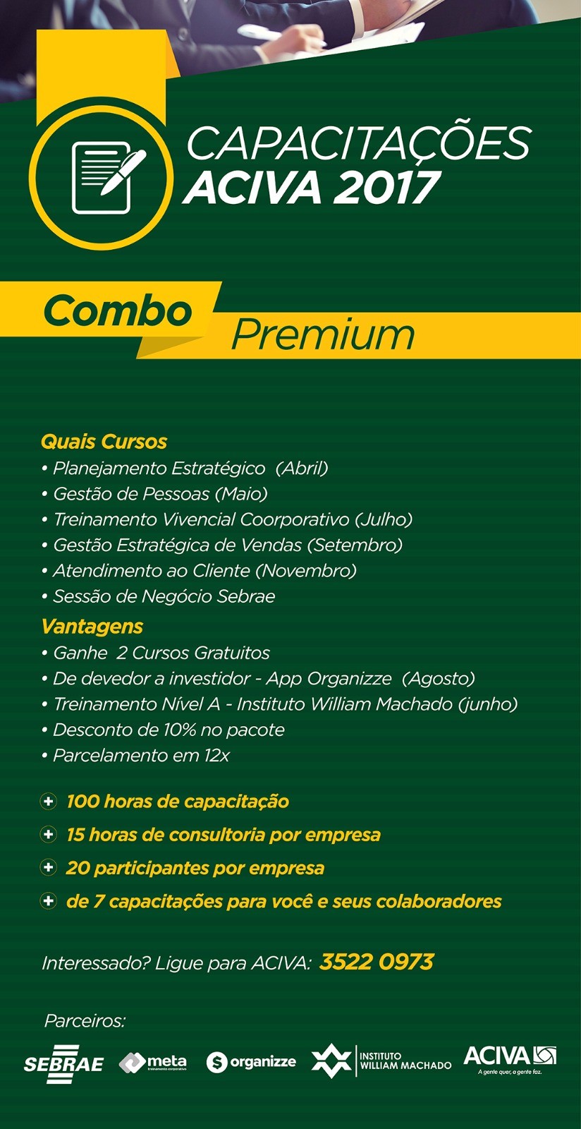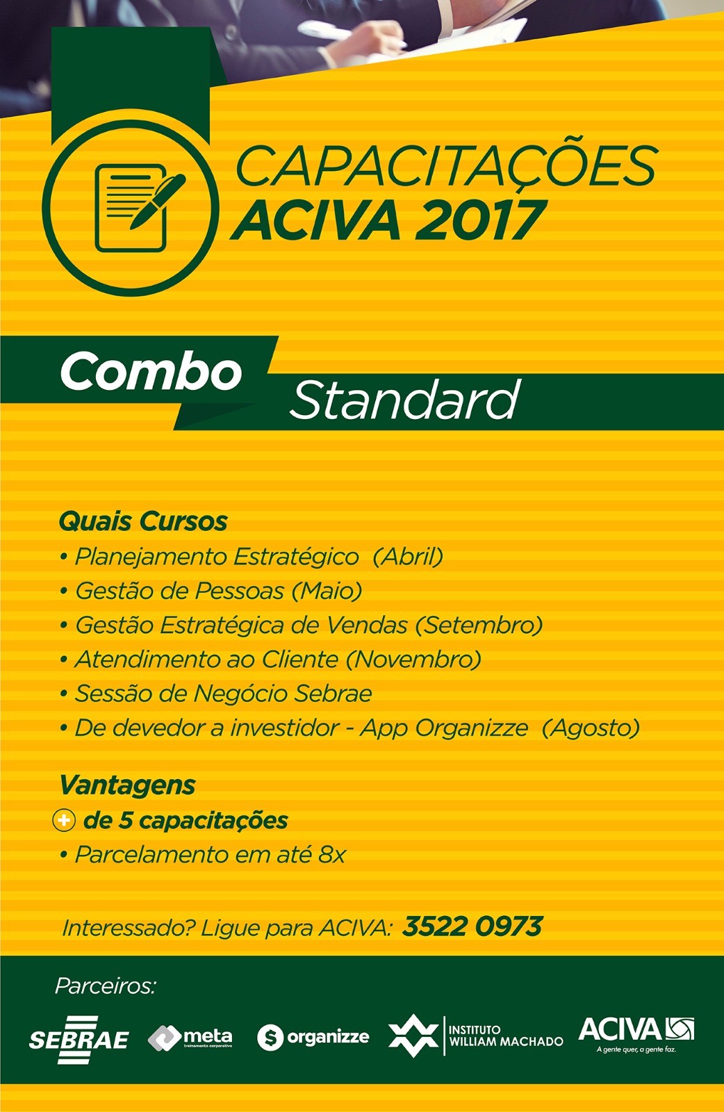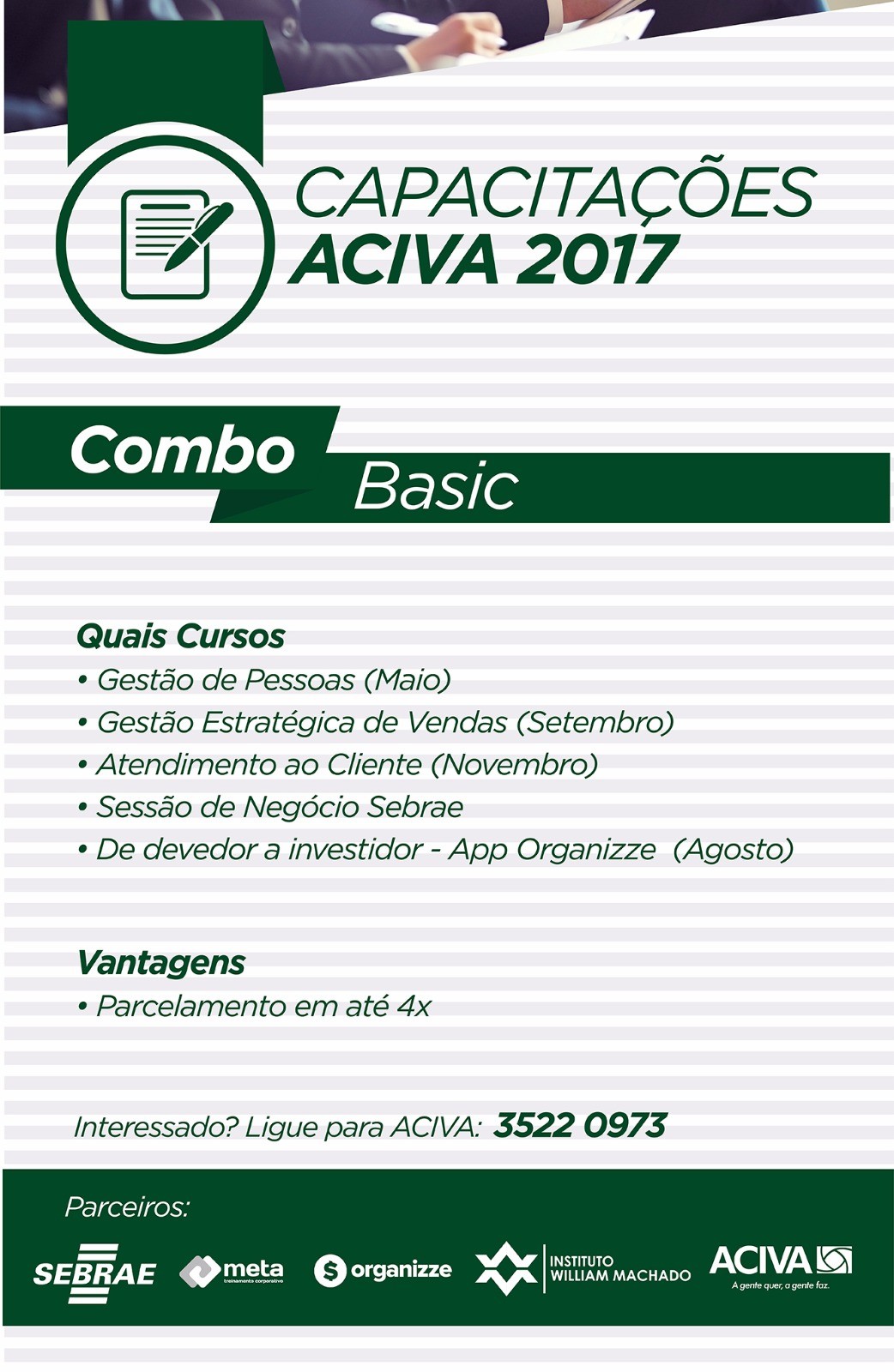 A Associação Empresarial de Araranguá e Extremo Sul Catarinense - Aciva, lançou recentemente combos com cursos de capacitação para o ano inteiro. São três opções: sendo elas o combo Basic, Standard e Premium. Todos eles com preços diferenciados e formas de pagamento facilitadas para quem é associado.