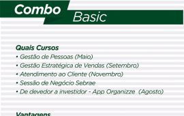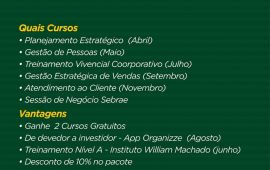 Dentro do pacote tem uma variedade de cursos para qualificação de empresários e funcionários, com temas voltados a Gestão de pessoas, Gestão Estratégica de Vendas, Atendimento ao Cliente, Sessão de Negócios, De Devedor a Investidor e muitos outros.