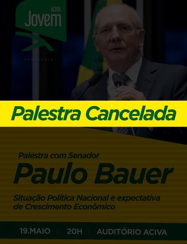 A palestra com o senador Paulo Bauer, que ocorreria nesta sexta-feira, dia 19, na Associação Empresarial de Araranguá e Extremo Sul Catarinense - ACIVA, foi cancelada. A decisão partiu do próprio parlamentar. Ele comunicou, via assessoria de imprensa, que o motivo da suspensão do evento se deu pela necessidade de Bauer ficar em Brasília neste momento, devido aos últimos acontecimentos na política nacional.