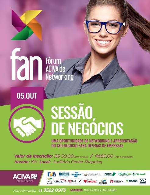A Associação Empresarial do Extremo Sul Catarinense – ACIVA, promove entre os dias 03 e 05 de outubro o Fórum ACIVA de Networking – FAN. Neste ano, o evento, que chega a 5ª edição e tem o apoio na organização dos núcleos ACIVA Jovem e ACIVA Mulher, será realizado no auditório Plínio Linhares, do Center Shopping Araranguá.