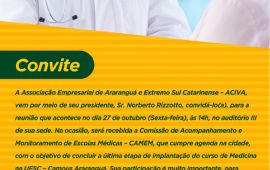 A Associação Empresarial de Araranguá e Extremo Sul Catarinense – ACIVA, vem por meio de seu presidente, Sr. Norberto Rizzotto, convidá-lo(a), para a reunião que acontece no dia 27 de outubro (Sexta-feira), às 14h, no auditório III de sua sede. Na ocasião, será recebida a Comissão de Acompanhamento e Monitoramento de Escolas Médicas – CAMEM, que cumpre agenda na cidade, com o objetivo de concluir a última etapa de implantação do curso de Medicina na UFSC – Campus Araranguá. Sua participação é muito importante para mostrarmos, e reforçarmos, a nossa união em prol da vinda do curso de Medicina para a Cidade das Avenidas.