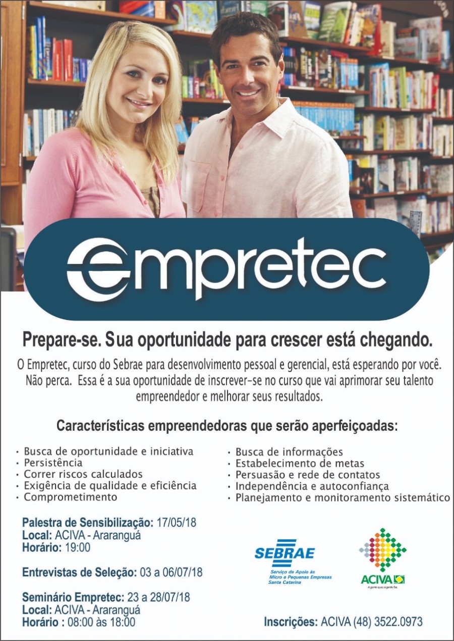 Um dos cursos de capacitação mais aguardados do ano, realizado pelo Sebrae o Empretec ocorrerá na Cidade das Avenidas na Associação Empresarial de Araranguá e Extremo Sul Catarinense – ACIVA. E quem estava aguardando por esta oportunidade, já pode garantir a inscrição.