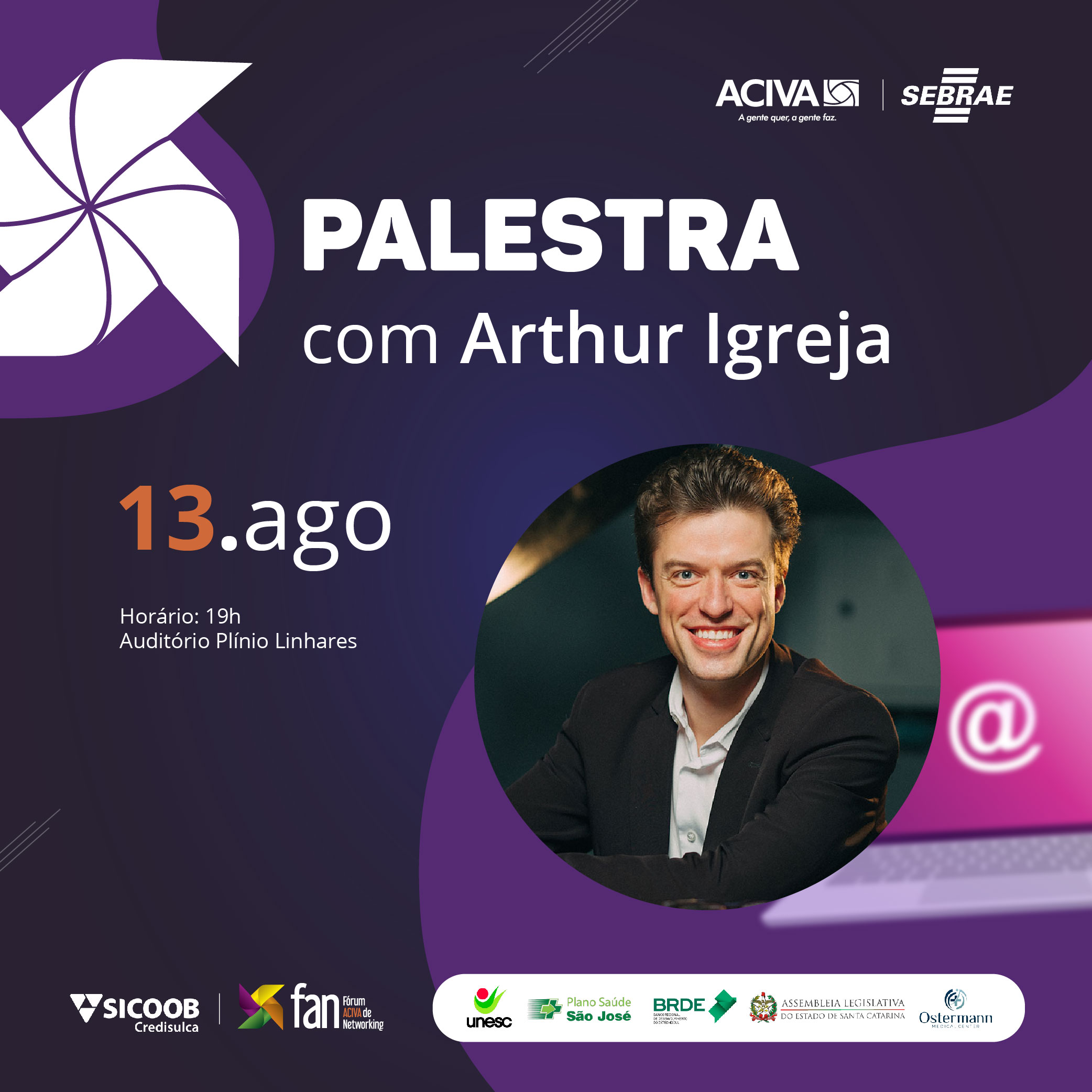 A palestra é uma realiza da Associação Empresarial de Araranguá e Extremo Sul Catarinense (ACIVA), em parceria com o Sebrae/SC e marcará a abertura oficial do 7º Fórum ACIVA de Networking (FAN), que terá uma programação diversificada, com palestras e sessão de negócios no mês de outubro.
