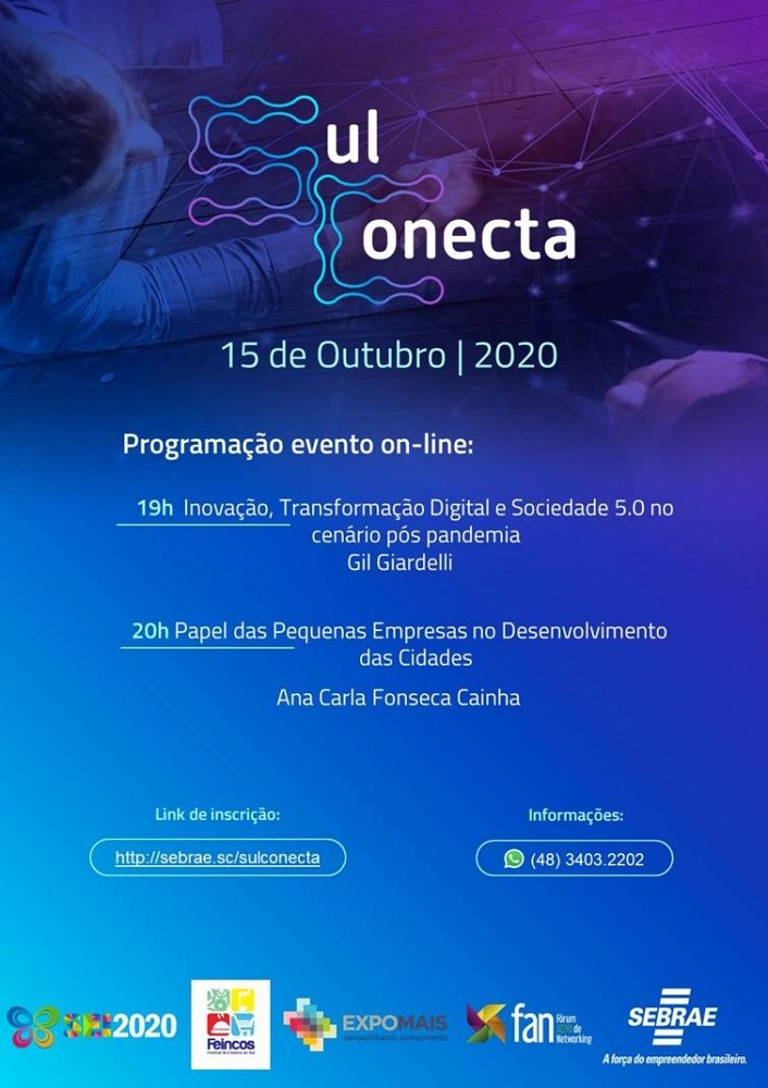 Quem tiver interesse em acompanhar o evento que será totalmente online e gratuito deve realizar uma inscrição prévia através do link sebrae.sc/sulconecta. Mais informações podem ser obtidas através do telefone (48) 3403-2202.